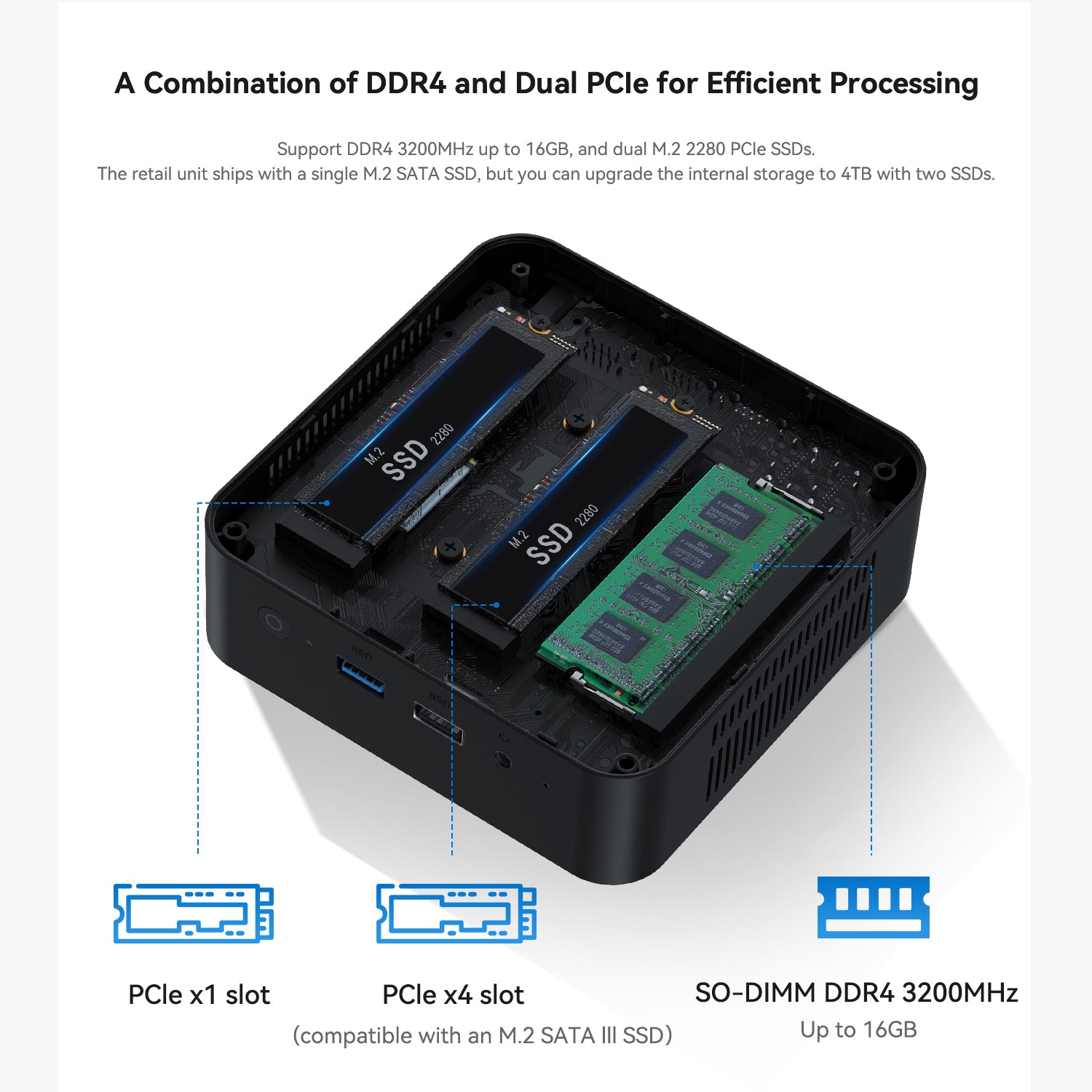 🎯【16G DDR4 +500GB SSD】N100 Mini PC has built-in 16GB DDR4 3200MHz (up to 3200MHz, single-channel ). It supports dual M.2 2280 PCle SSDs, KEY-N100 mini pc equipped with a single PCIE3.0*4 M.2 500G SSD(compatible with an M.2 SATA III SSD), another PCIE3.0*1 NVMe SSD(not include), you can upgrade the internal storage to 4TB with two SSDs.